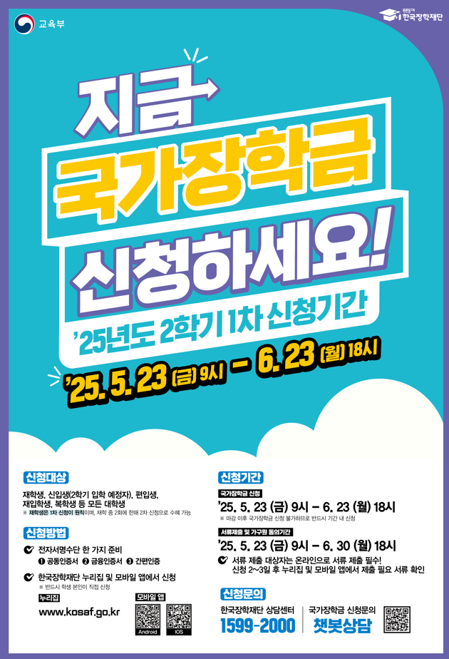 fnctId=bbs,fnctNo=222 글번호 918067 [장학] 2025학년도 2학기 국가장학금 1차 신청 작성일 2025.05.27 수정일 2025.05.27 작성자 문화관광경영학과 조회수 244 첨부파일 붙임1. (홈페이지)25년 2학기 국가장학금 2차 신청매뉴얼.pdf 미리보기 붙임2. (모바일)25년 2학기 국가장학금 2차 신청매뉴얼.pdf 미리보기 다음글 [채용] 2025 하나투어 문화관광경영학과 2025-05-29 15:55:26.0 이전글 [안내] 6월 도서관 이용 교육 문화관광경영학과 2025-05-27 11:17:16.0 RSS 2.0 총 611 개의 게시물이 있습니다. 게시물 검색 제목 작성자 게시글 리스트 공지사항 번호 제목 작성자 작성일 추천 비추천 조회수 첨부파일 611 [MOU] 전남대학교 문화관광경영학과 ·전남개발공사 업무협약 문화관광경영학과 2025.11.19 0 0 122 610 [모집] 2025학년도 AI 취업 역량 강화 캠프 문화관광경영학과 2025.10.20 0 0 107 609 [장학] 2026년도 한국지도자육성장학재단 일반장학생 문화관광경영학과 2025.10.20 0 0 101 608 [장학] 2025학년도 미래성장 장학생 선발 문화관광경영학과 2025.10.20 0 0 84 607 [모집] 2025 동계 5만기행 참가자 모집 문화관광경영학과 2025.10.13 0 0 114 606 [안내] 전남대(여수) 취업 포트폴리오 경진대회 문화관광경영학과 2025.09.26 0 0 108 605 [조사] 대학생 및 대학원생 인권 실태조사 문화관광경영학과 2025.09.25 0 0 80 604 [모집] 디지털 경제 생태계 PBL프로그램 문화관광경영학과 2025.09.15 0 0 97 603 [안내] 글로벌 모터스(GGM)현장캡스톤 디자인 특강 및 견학 관련 문화관광경영학과 2025.09.15 0 0 108 602 [채용] HOSKO 미국 AAA 5다이아몬드 알라바마 호텔 문화관광경영학과 2025.09.15 0 0 118 처음 162 1 2 3 4 5 6 7 8 9 10 다음 페이지 다음 끝